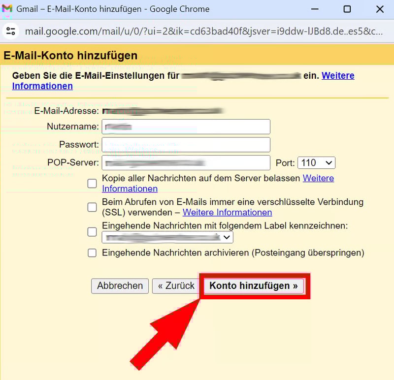Geben Sie Ihren Nutzernamen und Passwort sowie die POP3-Serverinformationen, die Sie bei Ihrem Domain-Provider finden, ein. Vielleicht werden letztere bereits automatisch ausgefüllt. Dann klicken Sie auf „Konto hinzufügen“.