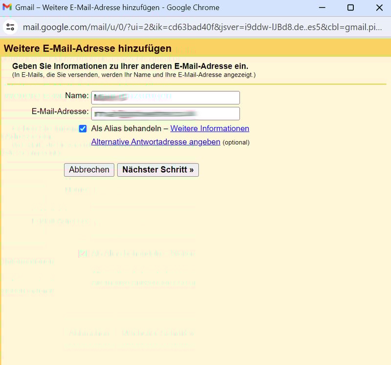 Geben Sie Ihren Namen und die E-Mail-Adresse Ihrer benutzerdefinierten Domain ein und lassen Sie die Option „Als Alias behandeln“ markiert. Dann klicken Sie auf „Nächster Schritt“.