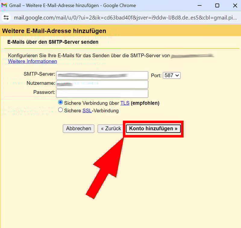 Fügen Sie Ihre SMPT-Daten ein, falls sie nicht automatisch angezeigt werden, sowie Ihren Nutzernamen und Ihr Passwort. Dann klicken Sie auf „Konto hinzufügen“.