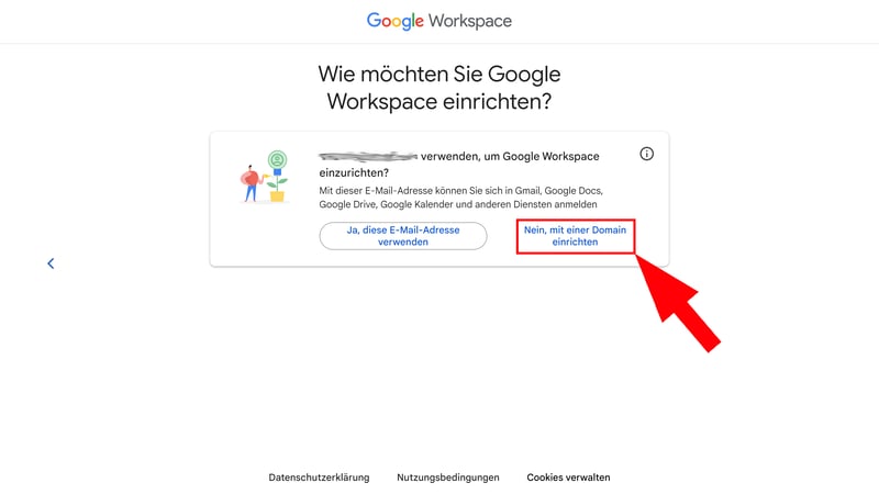 Schritt 2: Geben Sie Ihren Namen und eine aktuelle E-Mail-Adresse ein. Wählen Sie im nächsten Fenster „Nein, mit einer Domain einrichten“, um Ihren Workspace-Account mit einer benutzerdefinierten Domain anzulegen.