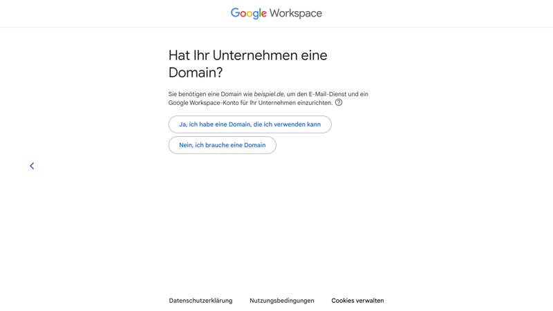 Schritt 3: Nun können Sie entweder eine neue Domain anlegen und direkt bei Google Workspace registrieren, oder eine Domain verwenden, die bereits in Ihrem Besitz ist.