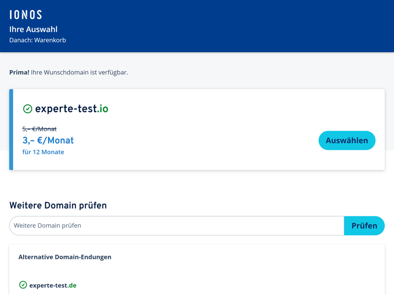 Allerdings sind .io-Domains vergleichsweise teuer: Mit jährlichen Kosten von 50 bis 100 € müssen Sie hier rechnen. Im EXPERTE.de Domain-Vergleich sehen Sie die Kosten für .io-Domains bei verschiedenen Anbietern auf einen Blick. Der Kauf der Domain ist bei allen gängigen Domain-Providern mit wenigen Klicks erledigt.
