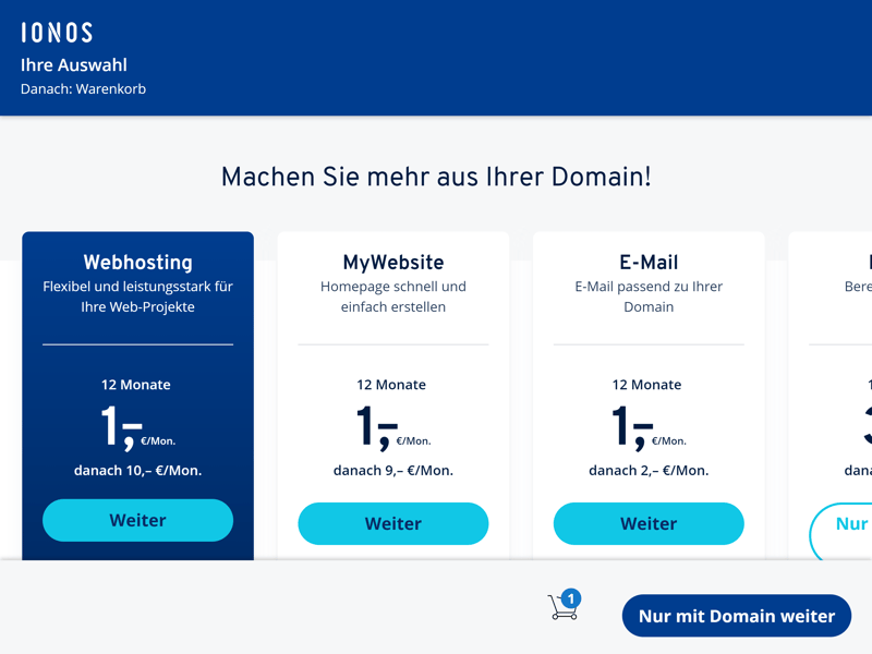 Schritt 4: Benötigen Sie Webhosting, E-Mails oder einen Homepage-Baukasten zur Domain? Jene können Sie im nächsten Schritt hinzufügen. Andernfalls klicken Sie auf Nur mit Domain weiter.