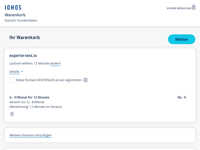 Schritt 3: Sie können nun Zusatzoptionen buchen oder weitere Domains dem Warenkorb hinzufügen. Wenn Sie Ihre Auswahl getroffen haben, klicken Sie unten rechts auf Weiter.