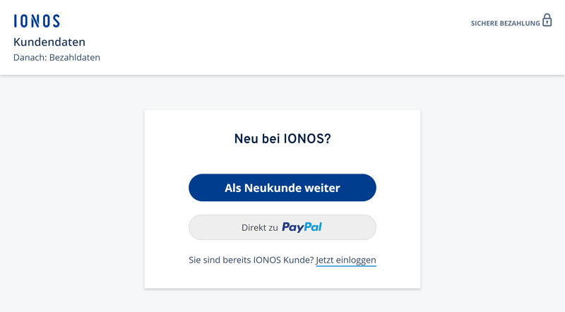 Sie haben noch kein IONOS-Konto? Dann können Sie es jetzt anlegen, oder direkt mit PayPal bezahlen.