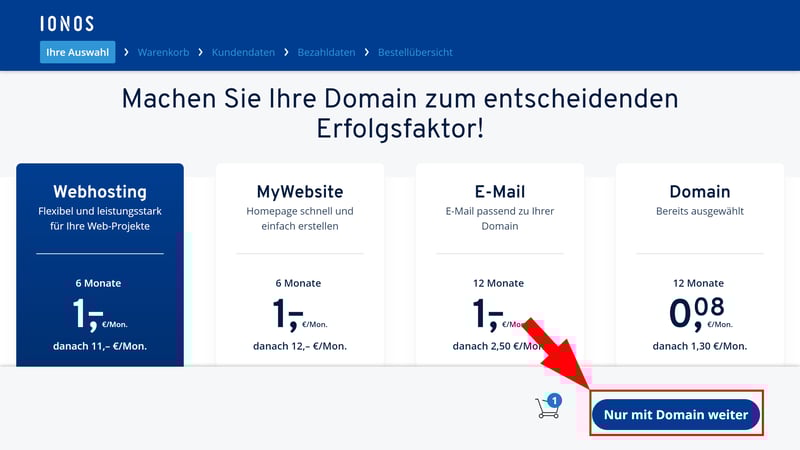 Bei IONOS klicken Sie dafür einfach auf auswählen, um ihn in den Warenkorb zu legen: