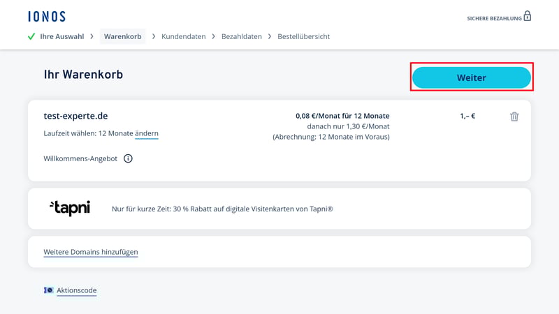 Schritt 1: Wenn Sie Ihre Wunschdomain in den Warenkorb gelegt haben, klicken Sie auf „Weiter“.