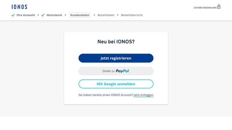 Schritt 4: Nun müssen Sie einen IONOS-Account erstellen, was per E-Mail, PayPal oder Google möglich ist. Falls Sie bereits einen haben, klicken Sie auf „Jetzt einloggen“.