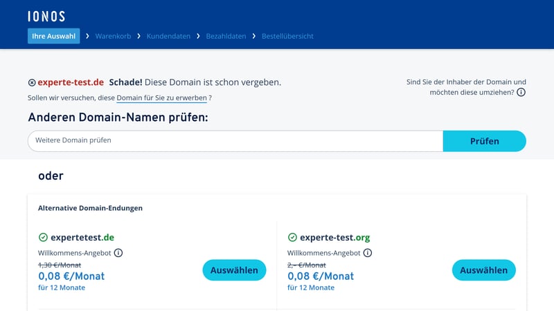 Natürlich kann es sein, dass Ihr Wunsch-Domainname schon weggeschnappt wurde. Bei IONOS wird dann etwa Folgendes angezeigt: