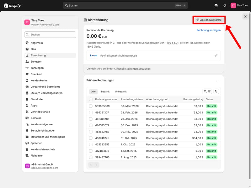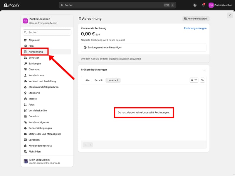 Sie können Ihren Shopify-Shop erst schließen, wenn Sie keine ausstehenden Rechnungen mehr haben. Stellen Sie also sicher, dass alle offenen Rechnungen an Shopify bezahlt wurden.