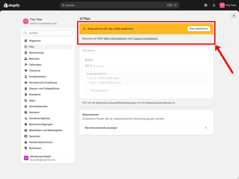 Ihr Abo ist nun deaktiviert und Ihr Shop wird zum Ende des Vertragszeitraums geschlossen. Unter „Einstellungen“ > „Plan“ wird das anstehende Vertragsende auch prominent angezeigt. Falls Sie sich doch noch umentscheiden, können Sie Ihren Plan hier auch mit wenigen Klicks wieder reaktivieren.