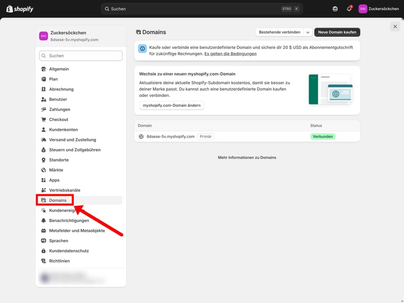 Diese und weitere Optionen finden Sie im Domain-Bereich in den Shopify-Einstellungen: