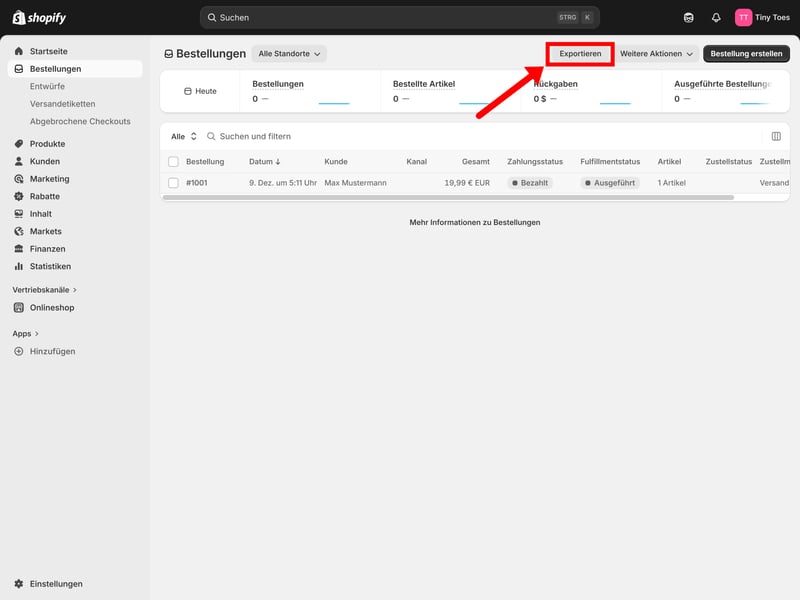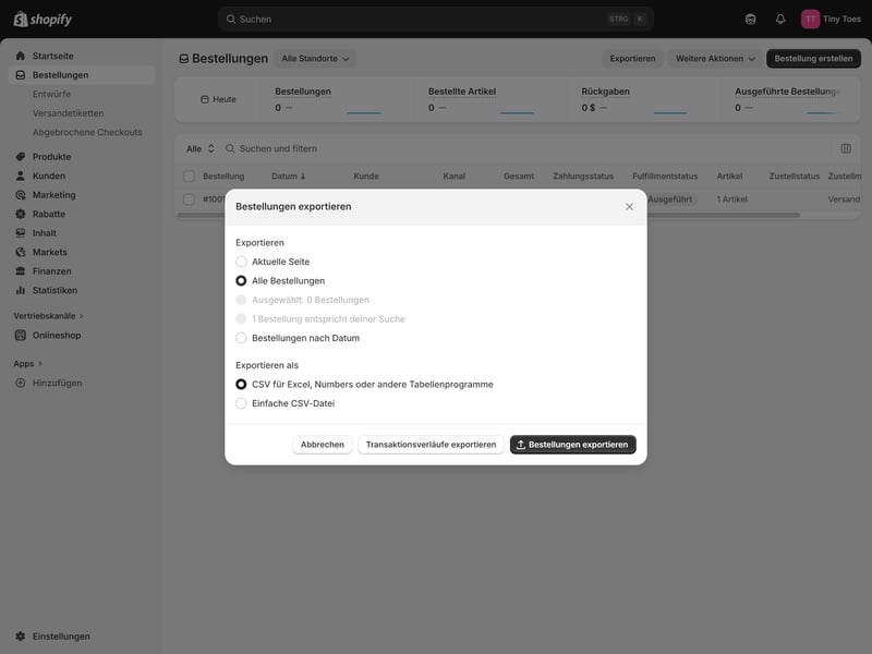 Damit Sie den Zugriff auf Ihre Daten auch nach der Shop-Schließung nicht verlieren, sollten Sie sie sichern und exportieren. Das geht mit fast allen wichtigen Daten – ob Bestellungen, Produkte, Kundenlisten oder Berichte. Klicken Sie im entsprechenden Bereich zunächst auf den „Exportieren“-Button: