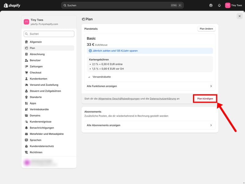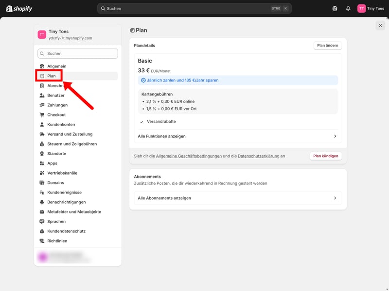 Schritt 1: Navigieren Sie in den Shopify-Einstellungen zum Bereich „Plan“.