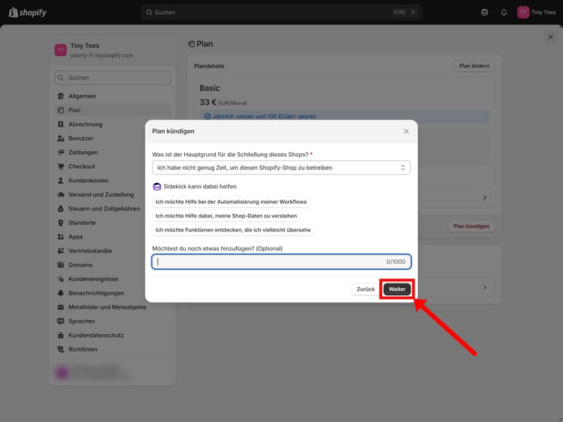 Schritt 4: Shopify möchte wissen, warum Sie Ihren Shop kündigen möchten. Sie können einen Grund im Dropdown-Menü auswählen oder selbst einen angeben. Nach der Auswahl klicken Sie auf „Weiter“.
