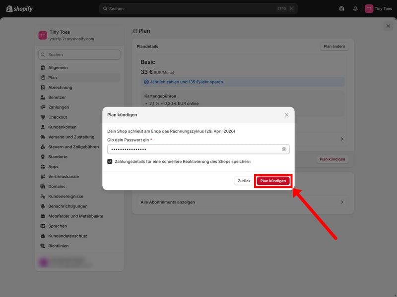 Schritt 5: Zum Schluss müssen Sie noch einmal Ihr Account-Passwort eingeben. Dann klicken Sie auf „Plan kündigen“, um die Kündigung abzuschließen.