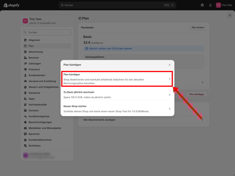 Schritt 3: Jetzt können Sie auswählen, ob Sie Ihren Plan kündigen, auf ein günstigeres Abo downgraden oder einen neuen Shop im gleichen Abo anfangen möchten. Klicken Sie auf „Plan kündigen“.