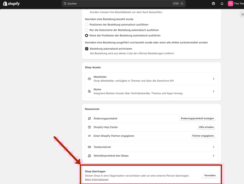 Übertragen Sie die Inhaberschaft für Ihren Shopify-Shop.