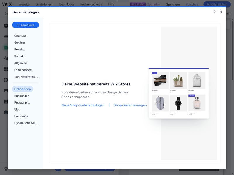 Wenn Sie einen Online-Shop erstellen, werden automatisch einige Standard-Seiten (Kategorie-, Produkt-, Warenkorb-, Checkout- und Bestätigungsseite) angelegt. Sie müssen also nicht bei Null anfangen, sondern erhalten sofort ein funktionierendes Shop-Gerüst, das Sie nur noch optisch und inhaltlich anpassen müssen.