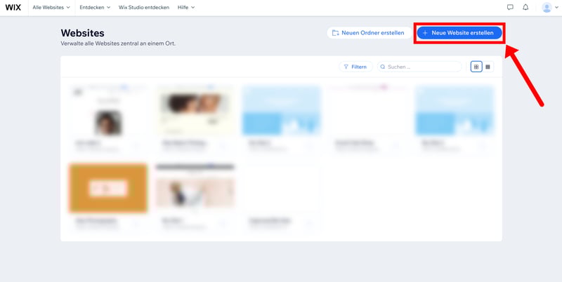 Im Admin-Bereich von Wix sind alle Ihre Shop- und Website-Projekte aufgeführt. Klicken Sie hier auf „Neue Website erstellen“, um ein neues Projekt anzulegen: