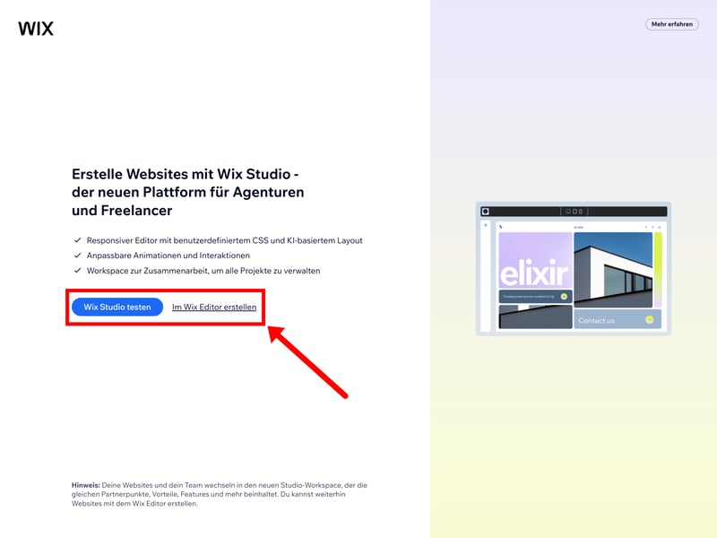 Als Nächstes stellt Wix Sie vor die Wahl: Möchten Sie Ihre Website mit „Wix Studio“ erstellen – oder mit dem „Wix Editor“? Dabei handelt es sich nicht nur um unterschiedliche Erstellungsmethoden, sondern um komplett eigenständige Plattformen. Die Entscheidung sollte also wohlüberlegt sein.