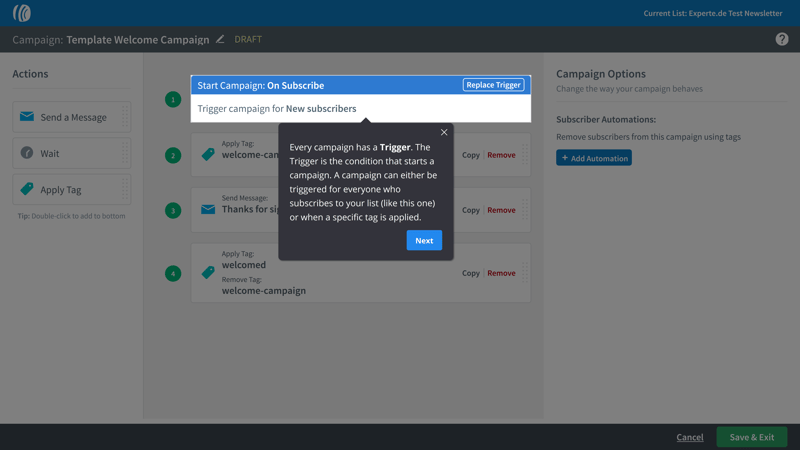 Die automatisierten Kampagnen lassen sich einfach anpassen und natürlich können Sie auch die verschiedenen Auslöser (Trigger) frei modifizieren. Im Laufe einer Kampagne können Sie verschiedene Trigger-Faktoren dazu nutzen, Tags zuzuweisen, Abonnenten anderen Gruppen zuzuordnen, alternative E-Mails zu versenden und mehr.