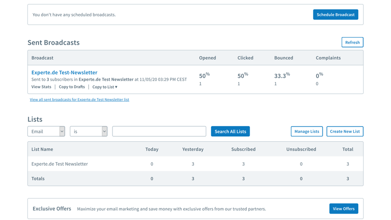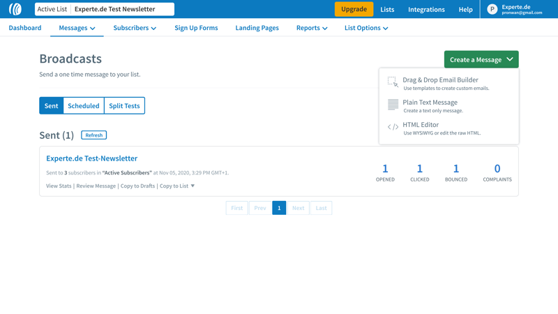 Klassische Newsletter können Sie im Bereich Broadcasts mit wenigen Klicks erstellen. Außerdem bekommen Sie hier eine Kurzübersicht über die Klick- und Öffnungsraten der letzten Newsletter.