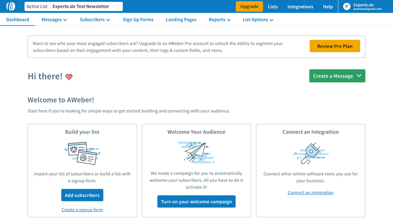Wenn Sie sich zum ersten Mal einloggen, legen Sie über einen Einrichtungsassistenten bereits Ihre erste Kontaktliste an und werden Schritt für Schritt durch die wichtigsten Einstellungen begleitet. Im Anschluss können Sie dann gleich Ihre erste Kampagne oder Ihren ersten Newsletter anlegen. Beachten Sie aber, dass AWeber ausschließlich in englischer Sprache zur Verfügung steht. Dies gilt für das gesamte Dashboard sowie den Support.