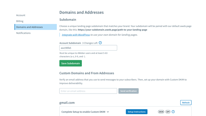 Darüber hinaus können Sie auch Ihre eigene Domain verbinden, um Landing-Pages, Tracking-Funktionen und mehr auch für Ihre eigene Seite zu nutzen und über AWeber auszuwerten. Sie werden Schritt für Schritt durch die entsprechenden DNS-Einstellungen geführt, die Sie durchführen müssen.