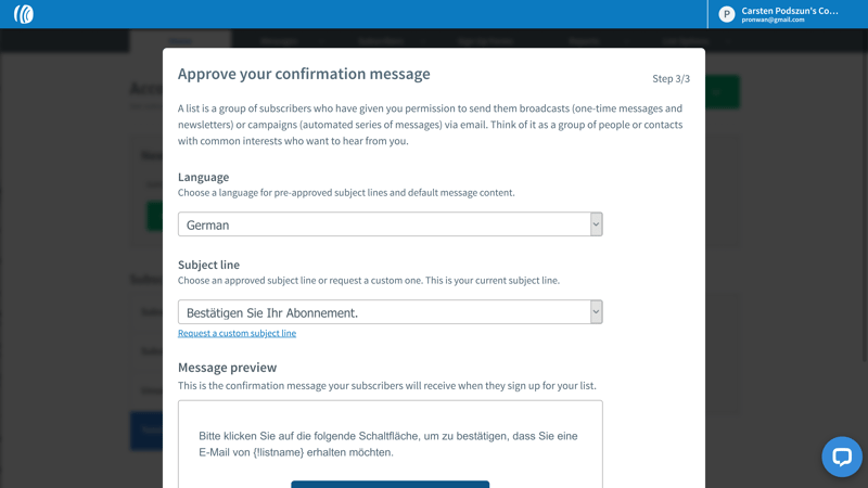 Besonders lobenswert ist, dass Sie bereits im Rahmen des Einrichtungsassistenten die Bestätigungseinstellungen für Ihre gesammelten Kontakte festlegen. Hier können Sie das DSGVO-konforme Double-Opt-In-Verfahren mit einer zweiten Bestätigungs-E-Mail aktivieren, was die Ersteinrichtung zusätzlich erleichtert.