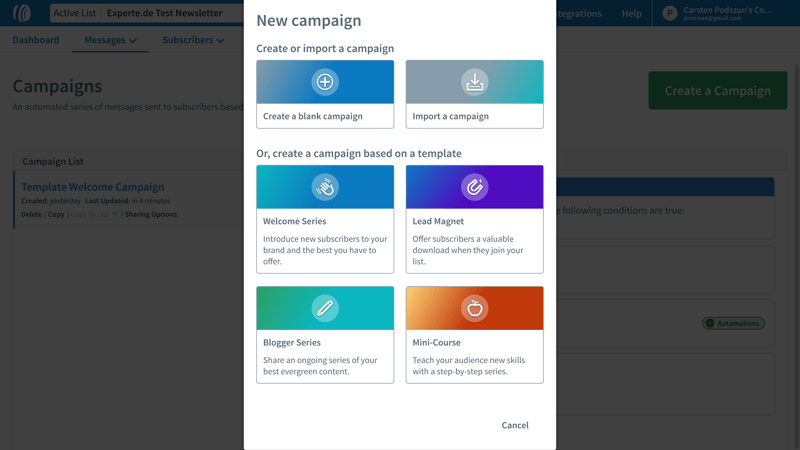 Dank sinnvoller Vorlagen müssen Sie keine Kampagne von Grund auf erstellen, sondern können vorgefertigte Kampagnen für Willkommens-E-Mails, Lead-Magnet-E-Mails, Blog-Serien oder E-Mail-Kurse anpassen. Auch der Import von Kampagnen, die andere Mitglieder erstellt haben, ist über Sharing-Codes möglich.