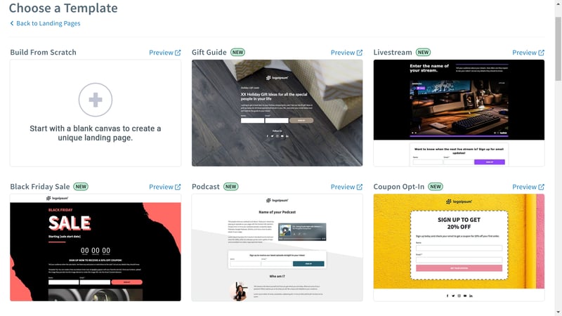 Über den Menüpunkt Landing Pages haben Sie die Möglichkeit, eigene Landing-Pages zu erstellen oder ein Template auszuwählen und es per Drag-and-Drop-Editor anzupassen. Fertige Seiten können entweder auf Ihre eigene Domain geschaltet (z.B. per WordPress-Plugin) oder bei AWeber gehostet werden.