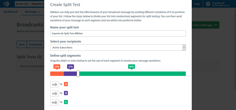Gut gelöst ist hingegen der Vergleich zwischen verschiedenen Kampagnen im Rahmen von Split-Tests, wie AWeber das A/B-Testing nennt. Hier können Sie genau festlegen, welche Empfängergruppen zu welchem prozentualen Anteil welchen Newsletter erhalten sollen; die Öffnungs- und Klickraten lassen sich dann übersichtlich vergleichen.