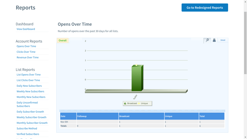 Detailstatistiken wie Öffnungen über längere Zeiträume hinweg, die genaue Performance verschiedener Links und mehr erhalten Sie nur in den kostenpflichtigen Paketen. Doch auch hier lassen die Statistiken etwas zu wünschen übrig: Alles wirkt etwas altmodisch, unübersichtlich und einige sinnvolle Funktionen wie Daten zum Standort der Empfänger oder auch Live- und Geo-Tracking sind nicht verfügbar.