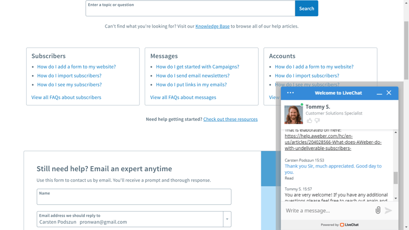Der Support bei AWeber ist erstklassig. Es steht nicht nur rund um die Uhr ein Live-Chat zur Verfügung, sondern Sie können den Anbieter während der US-Geschäftszeiten auch telefonisch sehr gut erreichen; selbst, wenn Sie das kostenlose Paket nutzen. Ergänzt wird der exzellente Support durch eine übersichtliche FAQ-Datenbank und E-Mail-Support.