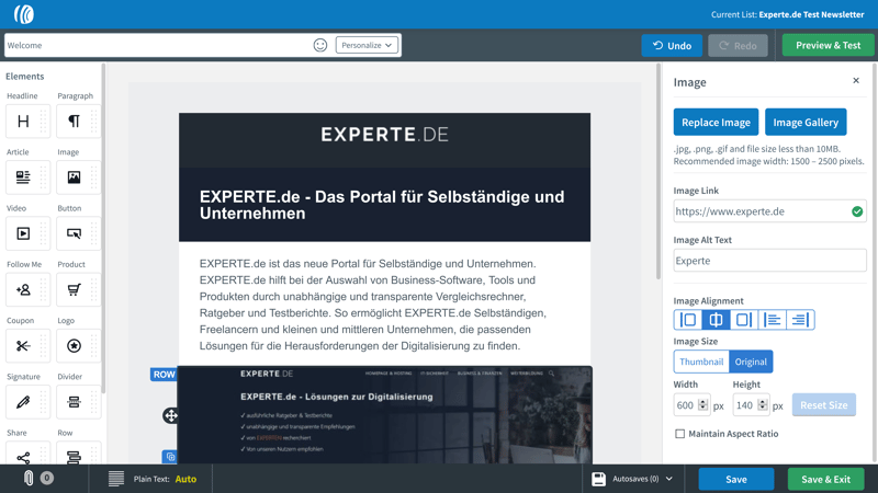 Der Editor für die Newsletter selbst ist ebenso benutzerfreundlich wie die Formular- und Landing-Page-Editoren. Per Drag-and-Drop können Sie einfach Elemente hinzufügen, verändern oder anpassen. Auch hier kommt Ihnen der Zugriff auf Stock-Fotos zugute, die Sie in Ihre E-Mails einbinden können.