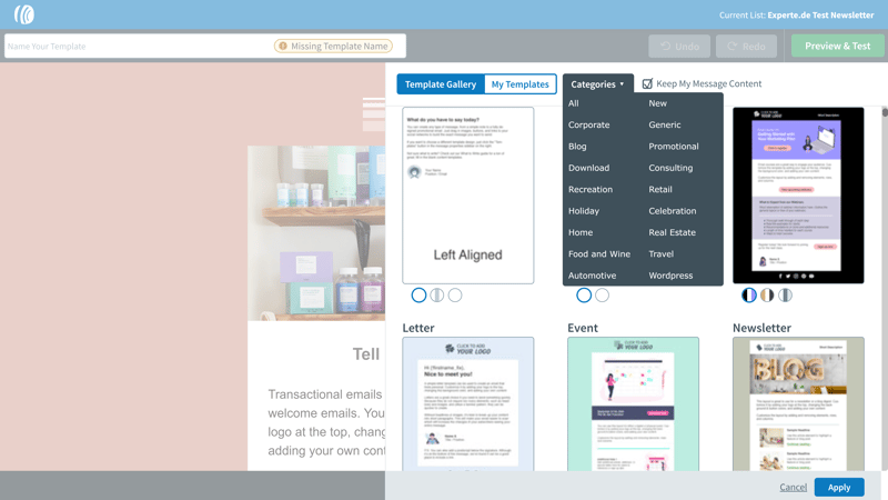 Die Design-Vorlagen für Ihre Newsletter sind vielfältig, und dank guter Filterfunktionen können Sie gezielt nach dem passenden Template für jeden Newsletter suchen. Die meisten Templates stehen in verschiedenen Farbvarianten zur Auswahl und lassen sich dann mit einem Klick in den Editor übernehmen.