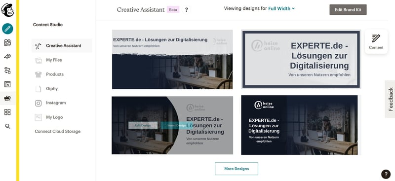 Eine Besonderheit bei Mailchimp ist der Creative Assistant. Damit haben es Einsteiger besonders leicht, sich passende Designs und Bilder für Formulare und Webseiten automatisch erstellen zu lassen.