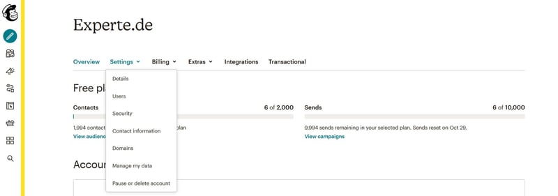 Neben den Integrationen können Sie hier auch die transaktionalen E-Mails aktivieren, die jedoch nach den ersten 500 Test-E-Mails kostenpflichtig werden. Wenn Sie ein Abonnement gebucht haben, haben Sie zudem die Möglichkeit, weitere Nutzer anzulegen. Der kostenlose Account ist auf einen Nutzer begrenzt.