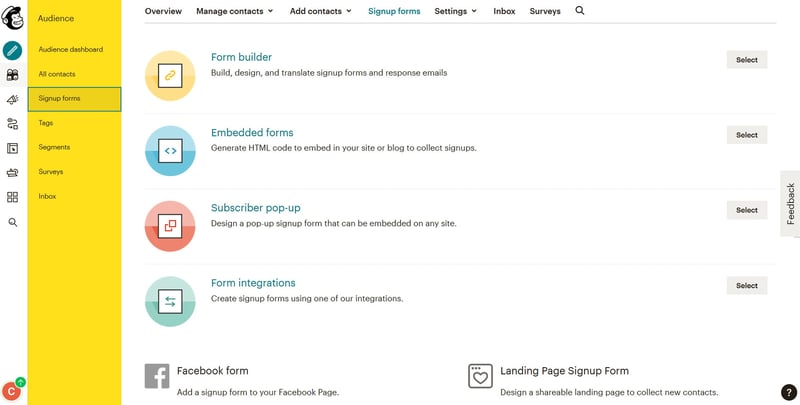 Im Menüpunkt Website können Sie Landing-Pages erstellen, über die Sie ebenfalls Kontakte sammeln können. Außerdem können Sie hier Ihre Domain verknüpfen oder eine eigene Domain direkt bei Mailchimp kaufen.