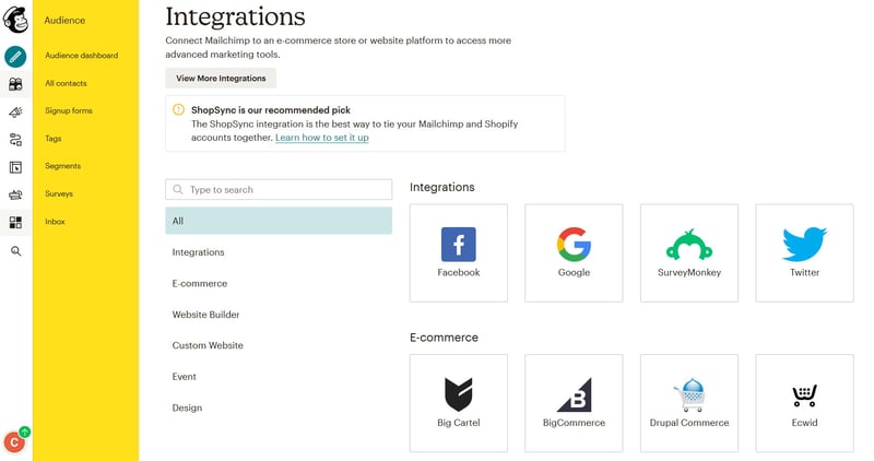 Falls Sie Mailchimp für transaktionale E-Mails nutzen möchten, die an Ereignisse in Ihrem Online-Shop oder auf Ihrem Blog gekoppelt sind, empfehlen wir, diese Schnittstelle zuerst einzurichten. Dies ist dank zahlreicher Plug-ins mit Diensten wie WordPress, WooCommerce, Shopify, Drupal, Facebook oder Magento problemlos möglich.