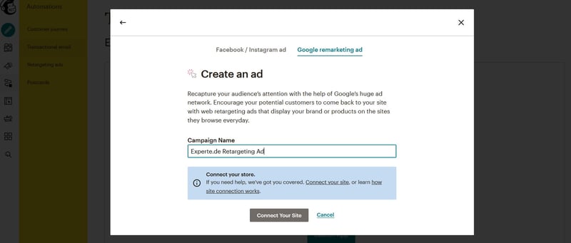 Zusätzlich können Sie im Bereich Ad eigene Werbekampagnen erstellen. Verknüpft mit Google Analytics, Facebook oder Instagram bilden Sie eine gute Ergänzung zu den Mail-Kampagnen.