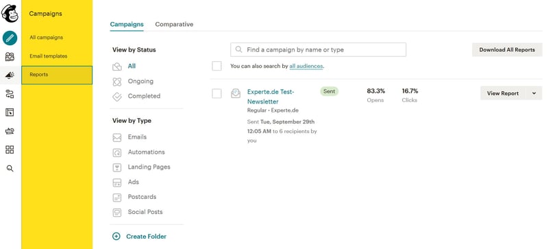 Im Bereich Statistiken überzeugt Mailchimp vor allem durch die sehr gute Übersicht über alle wichtigen Kampagnen-Daten auf einen Blick. Mit einem Klick auf Campaigns -> Reports gelangen Sie direkt zur Übersichtsseite, auf der jeweils Öffnungs- und Klickraten Ihrer Kampagnen angezeigt werden. Über View Report können Sie sich die detaillierten Statistiken der jeweiligen Kampagne anschauen.