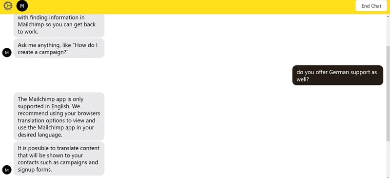 Der Support bei Mailchimp beschränkt sich im kostenlosen Paket auf ein Chatbot-System und E-Mail-Support, der im Test allerdings mit über 10 Stunden Wartezeit (Anfrage um 6:00 Uhr MEZ versendet) recht träge war. Die Antwort war jedoch freundlich und kompetent, denn passende Lösungsansätze wurden gleich präsentiert.