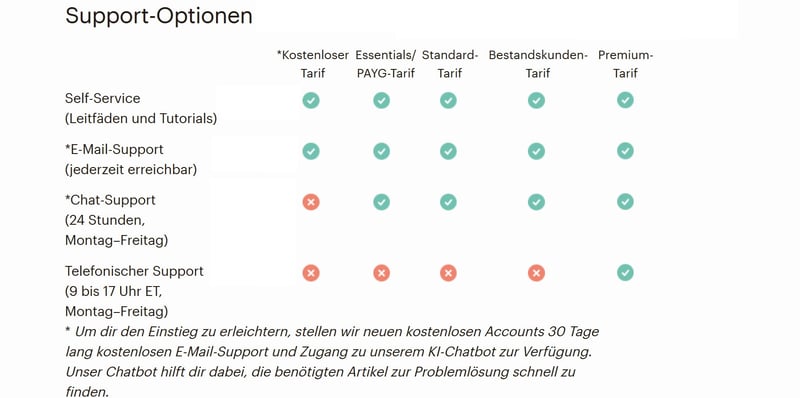 Erst ab dem Essentials-Tarif erhalten Sie zusätzlich einen 24-Stunden Live-Chat-Support in englischer Sprache. Den Telefon-Support gibt es hingegen ausschließlich für Premiumkunden.