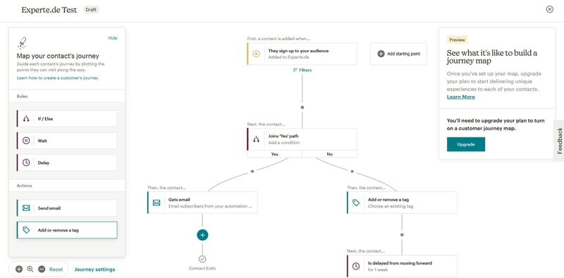 Der Workflow-Editor ist ebenfalls gut gelungen. Hier können Sie automatische Kampagnen erstellen, Knotenpunkte und Bedingungen einrichten und mit wenig Aufwand komplexe Abläufe realisieren.