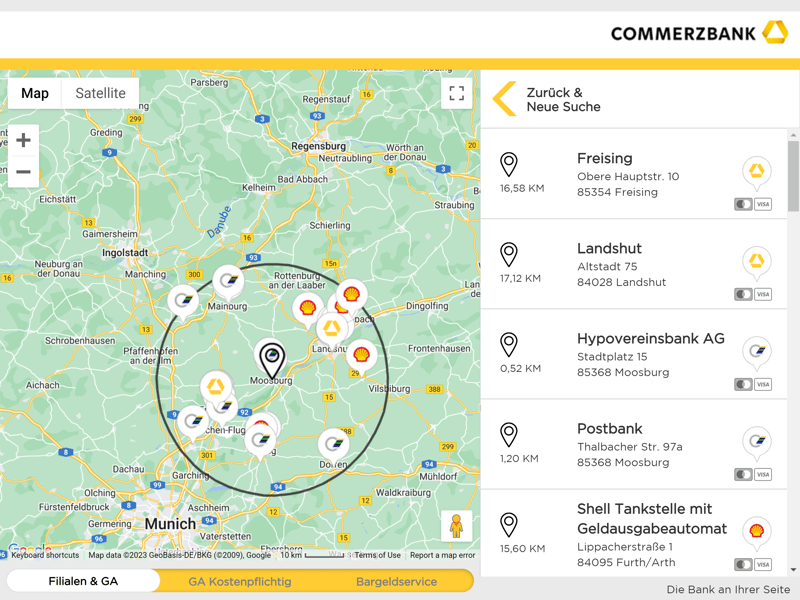 Als Commerzbank-Kunde profitieren Sie zunächst vom Filialnetz der Bank und der flächendeckenden Verfügbarkeit passender Geldautomaten. Zusätzlich zu den rund 400 Commerzbank-Filialen in ganz Deutschland stehen Ihnen auch die 6.000 Geldautomaten der Cash Group zur Verfügung.