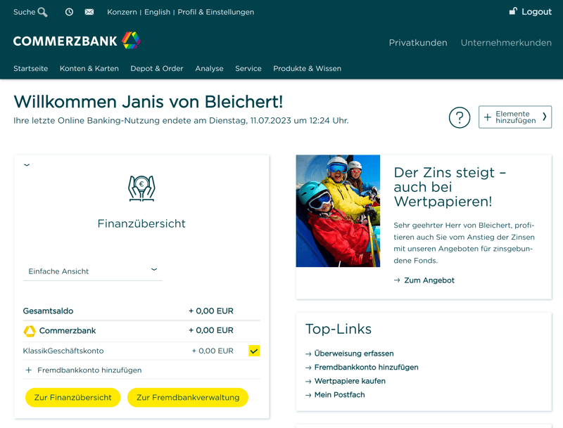 Wenn Sie Ihren Freischaltungscode erhalten haben, können Sie sich im Online-Banking-Portal der Commerzbank anmelden.