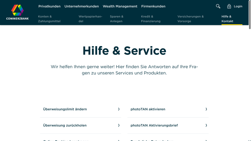 Im Hilfebereich der Commerzbank finden Sie zunächst eine Auswahl wichtiger FAQs, Anleitungen und Formulare: Hier finden Sie heraus, wie Sie das Überweisungslimit ändern, eine Girocard sperren oder Online-Banking beantragen.