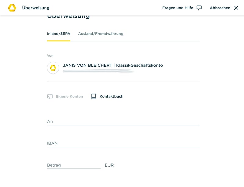 Eine Überweisung tätigen Sie unter Konten & Karten > Überweisen. Das Formular für Überweisungen ist einfach gehalten: Oben wählen Sie zunächst aus, ob es sich um eine SEPA-Inlandsüberweisung oder eine Auslandsüberweisung/ Überweisung in einer Fremdwährung handeln soll.